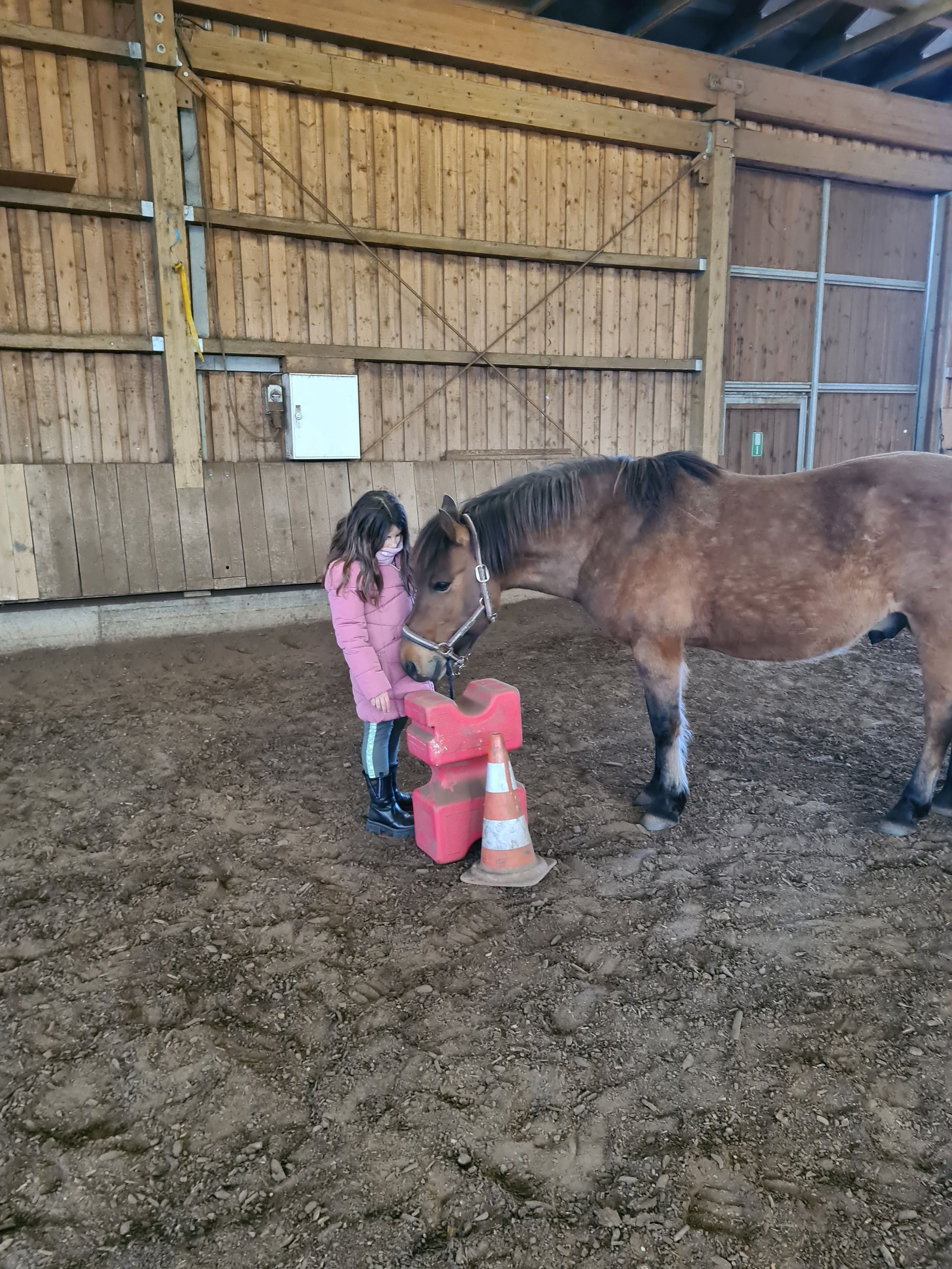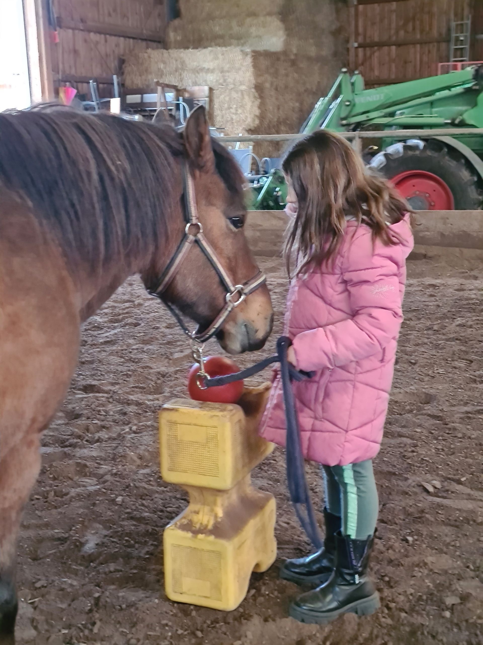 Ich gehe ganz individuell auf ihr Kind ein, so bekommt es mal eine kleine Aufgaben wie zum Beispiel das Pferd über eine Stange zu führen, um Hütchen herum, wir gehen zusammen spazieren oder bemalen das Pferd mit Fingerfarbe.